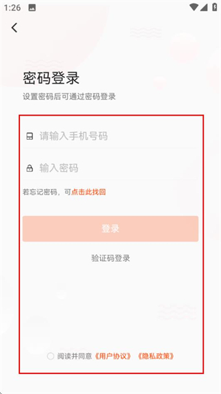 4、在密码登录页面,填写信息并勾选协议后,点击登录完成账号登录。