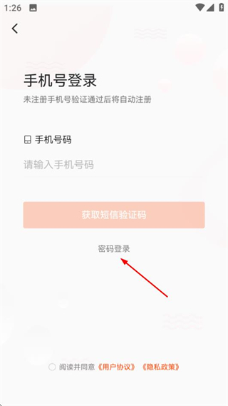 3、在手机号登录页面,点击密码登录选项,进入密码登录页面。