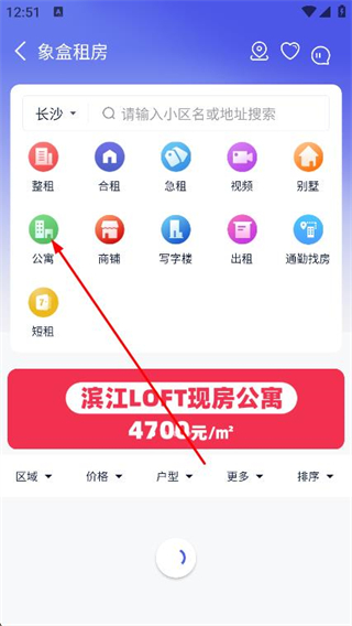 1、打开象盒找房app,点击首页的租房选项进入房源列表页面。