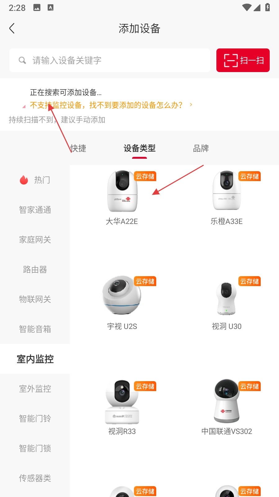2、在添加设备页面中,等待搜索可添加设备或者选择要添加的设备类型,点击对应设备图标。