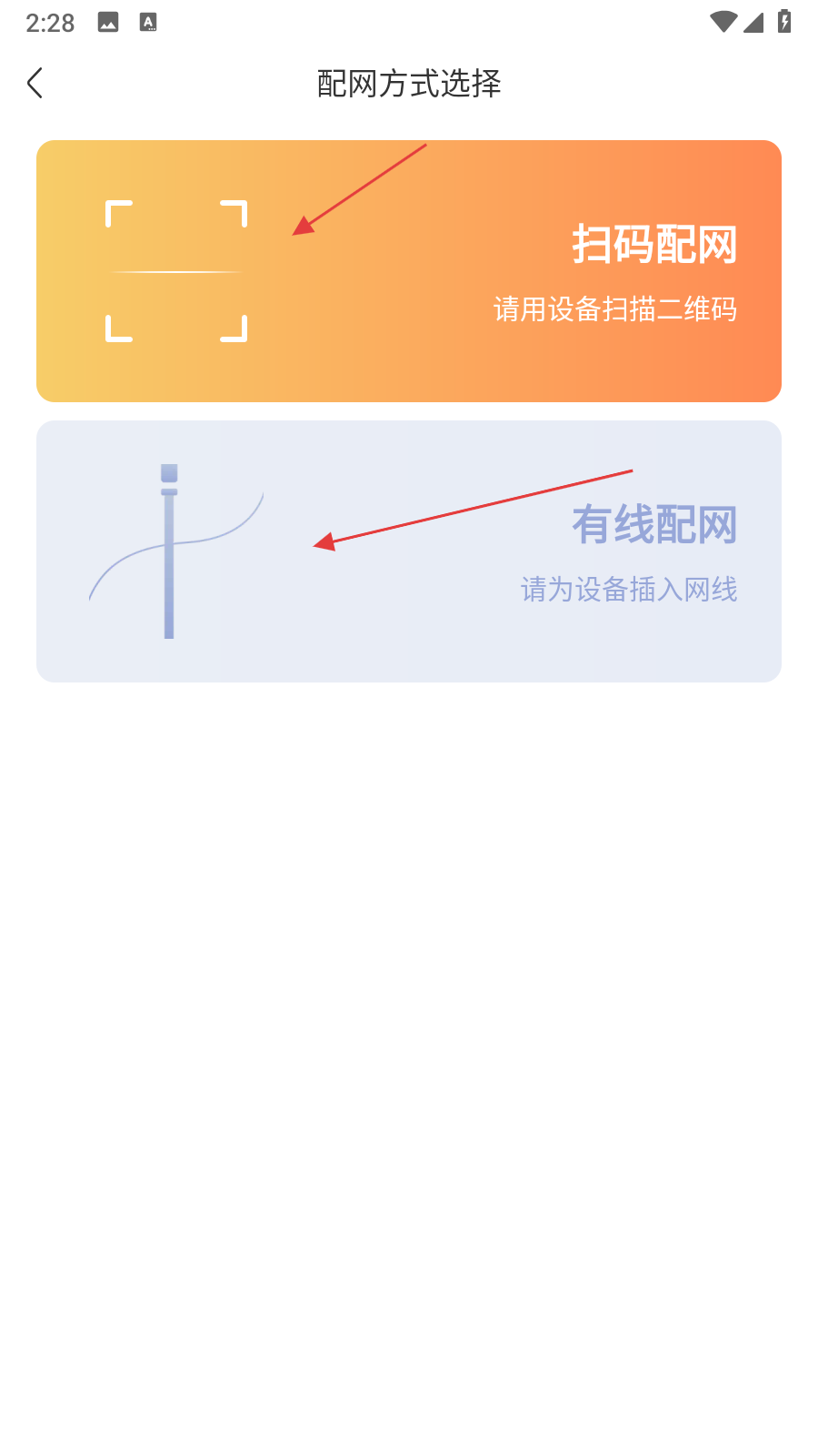 3、进入配网方式选择页面后,选择扫码配网或有线配网,按提示完成设备配网,即可成功添加设备。