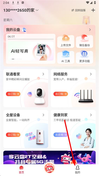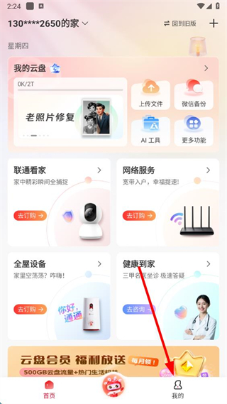 1、在联通智家app首页,点击右下角我的选项,进入个人中心页面。