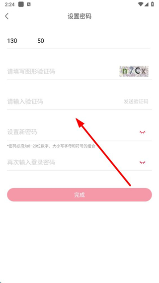 4、在设置密码页面,依次填写验证码,设置新密码,点击完成即可修改密码。