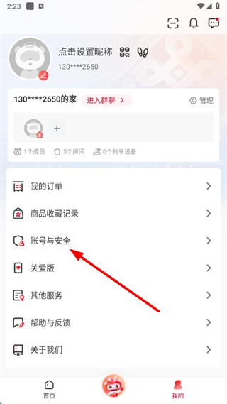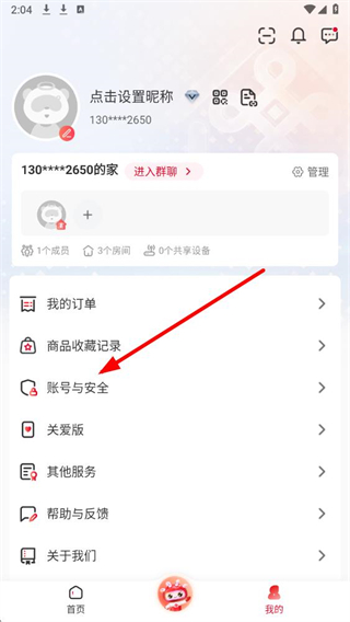 2、进入我的页面后,找到账号与安全选项并点击,进入账号安全相关的功能界面。
