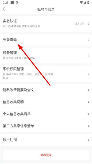 3、在账号与安全页面,点击登录密码选项,进入设置密码流程。