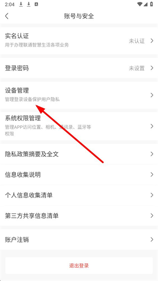 3、在账号与安全界面中,找到设备管理选项并点击,进入设备管理页面,可查看当前已登录的设备信息。
