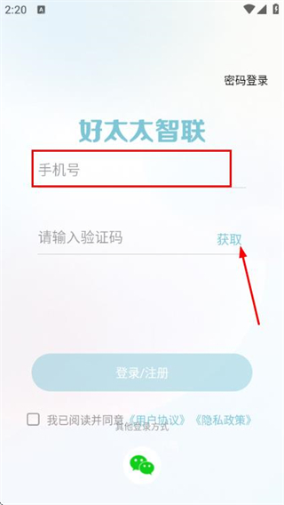 2、在手机验证登录页面填写手机号,勾选协议后,点击获取。