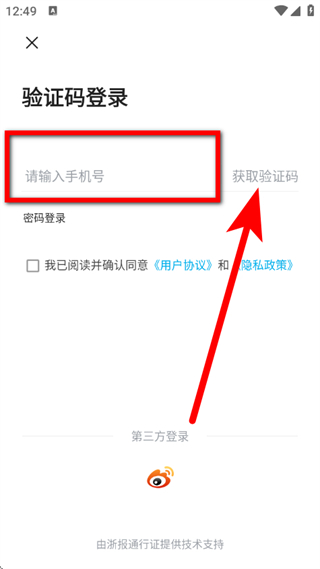 3、在验证码登录界面,输入手机号,点击获取验证码。