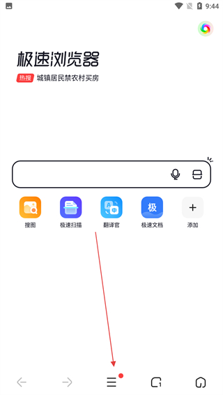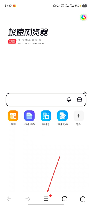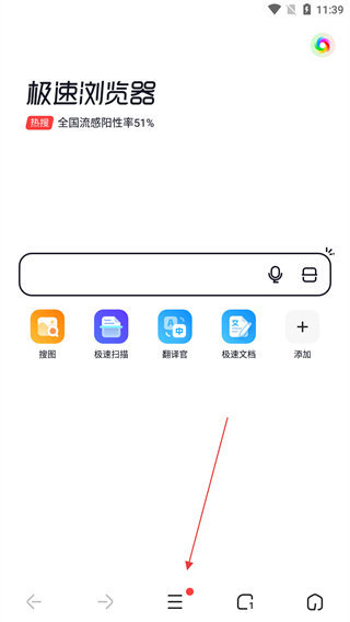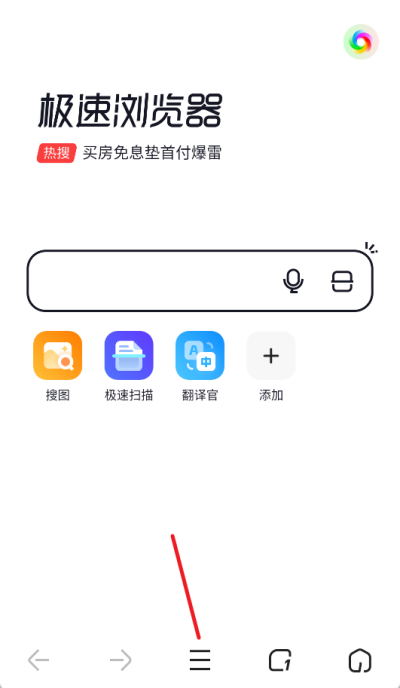 1、打开360极速浏览器进入主界面,点击底部的菜单按钮。