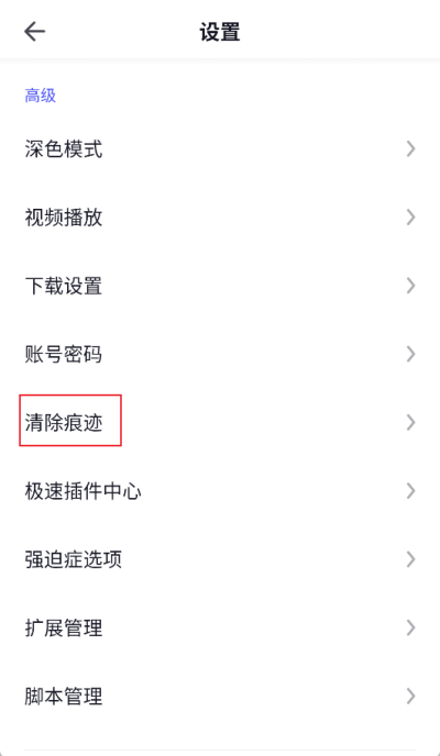 3、点击后进入设置功能界面,将该界面的所有功能进行下拉,找到高级一栏中的【清除痕迹】选项;