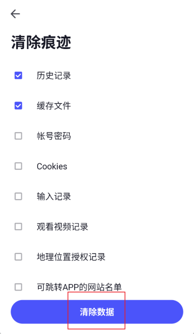 4、点击后进入相应界面,在这里将所有的选项全部选择,最后点击下方的【清除痕迹】选项即可清理缓存。