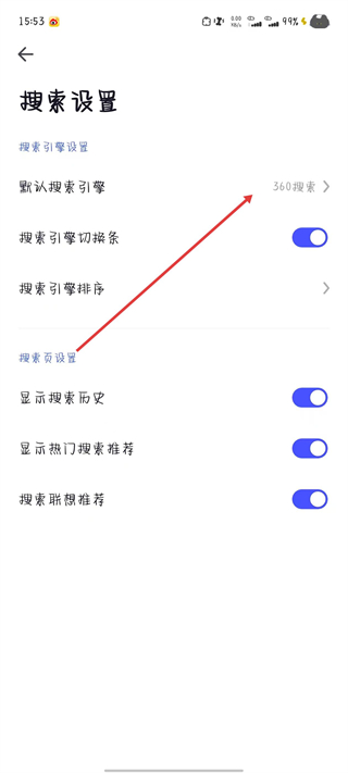 4、在搜索设置页面,点击默认搜索引擎选项。
