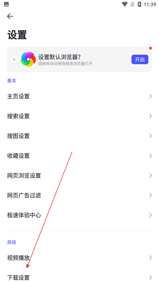 3、在设置页面的高级分类下,点击进入下载相关的设置界面。