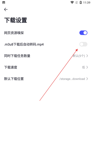 4、在下载设置界面中找到自动转码的开关,点击开关将其开启。