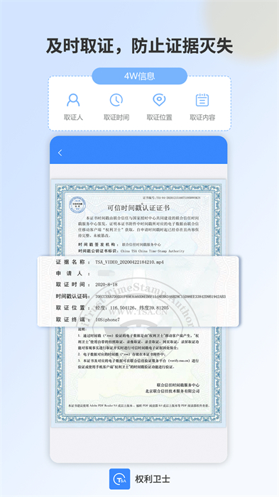 权利卫士app是一款安卓平台的手机取证应用,通过该应用可以将手机产生的通话录音,手机录音,拍照,手机录像等电子文件进行固化,固化之后的文件即时申请时间戳认证服务,经过时间戳认证服务后该文件即具备不可否认,不可修改的特点.需要的赶紧来下载吧