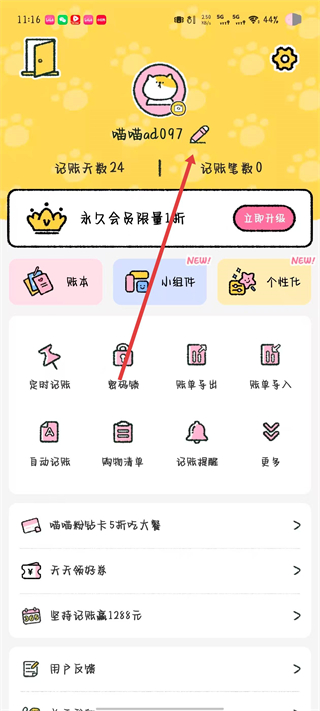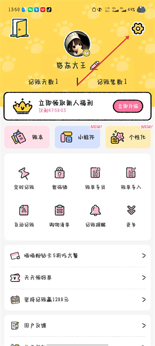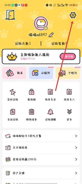 1、打开喵喵记账APP,点击右下角我的选项,进入个人中心页面。