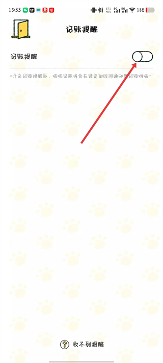 4、在记账提醒设置页面找到记账提醒功能开关,将其开启即可。