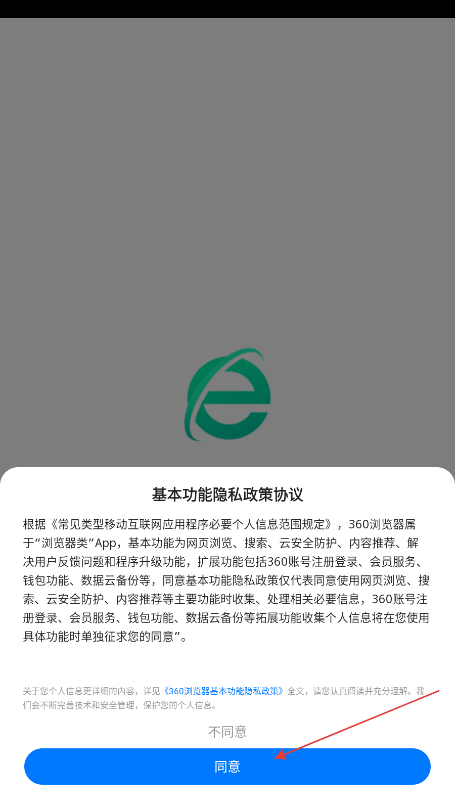 1、启动360浏览器的应用软件,进入时会跳出隐私政策,点击同意的按钮。
