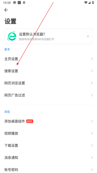 2、在设置页面的基本分类下找到搜索设置选项,点击该选项进入搜索相关的设置界面。