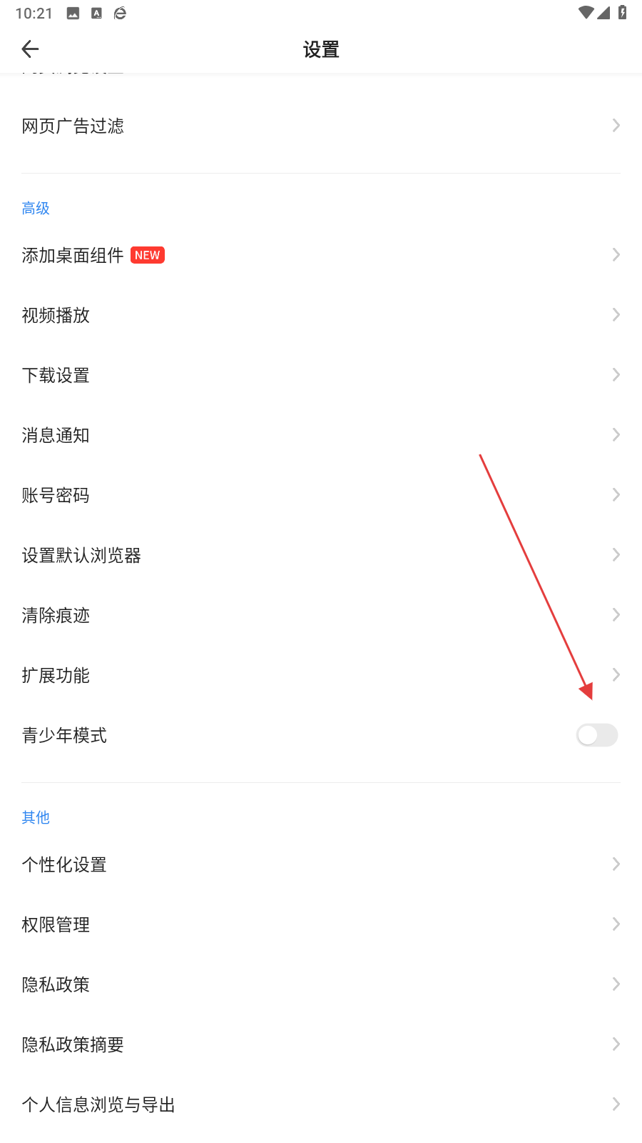 4、进入设置的页面内,向下滑动找到并开启右侧青少年模式的按钮。