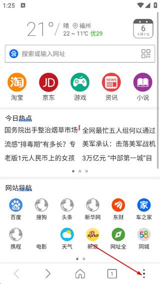 1、在浏览器首页,点击右下角的三点按钮,打开功能菜单。