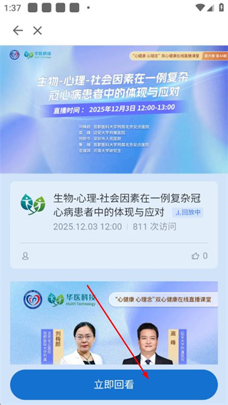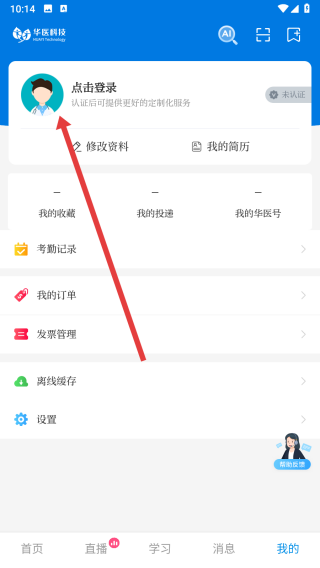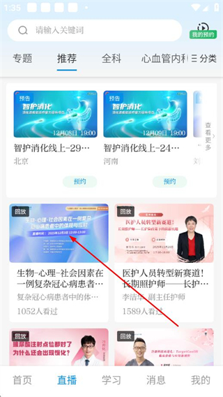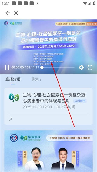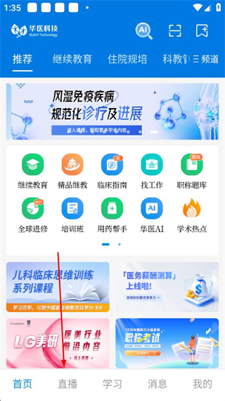 1、在掌上华医app的首页,点击底部直播选项,进入直播页面。