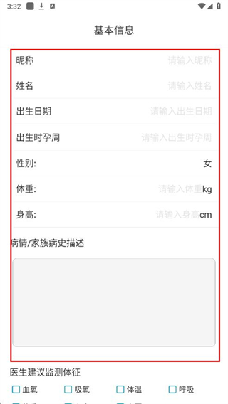2、在基本信息页面填写昵称、姓名、出生日期、出生时孕周、性别、体重、身高等信息。