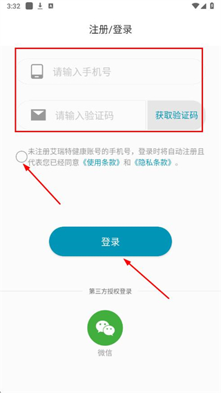 1、打开艾瑞特健康APP,输入手机号,点击获取验证码并填入,勾选条款后,点击登录。