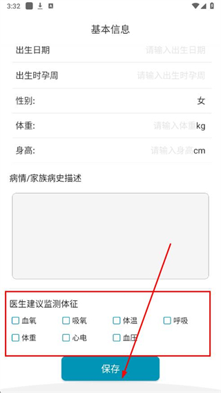 3、选择医生建议监测的体征,如血氧、体温等后,点击保存,完成账号注册流程。