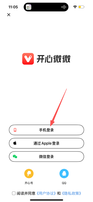 1、在开心微微的首页,点击底部的我的选项,进入登录选择页面。