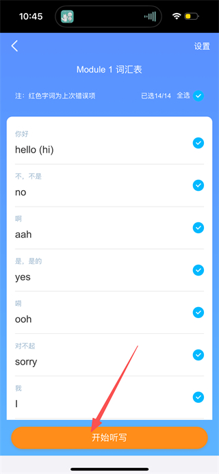 3、在词汇表页面,确认选中词汇后点击开始听写按钮,启动单词听写练习。