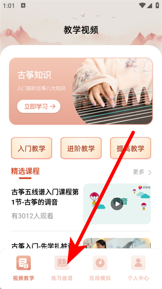 4、在练习界面,查看带指法标注的曲谱,跟随提示进行古筝练习。