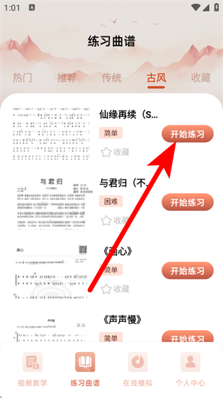 3、在选择曲谱,点击对应的开始练习,进入曲谱练习界面。