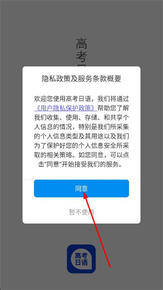 1、打开高考日语app,在弹出的隐私政策窗口中,点击同意按钮。