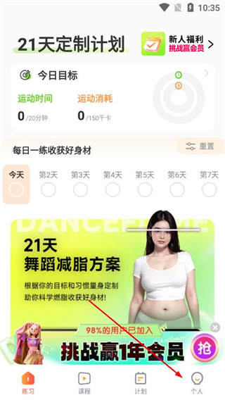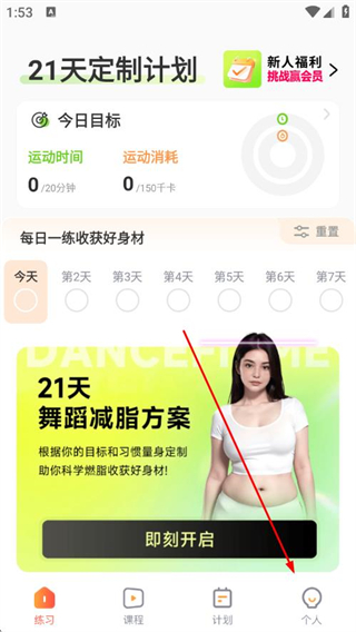 1、在热汗舞蹈app的首页,点击底部个人选项,进入个人中心页面。