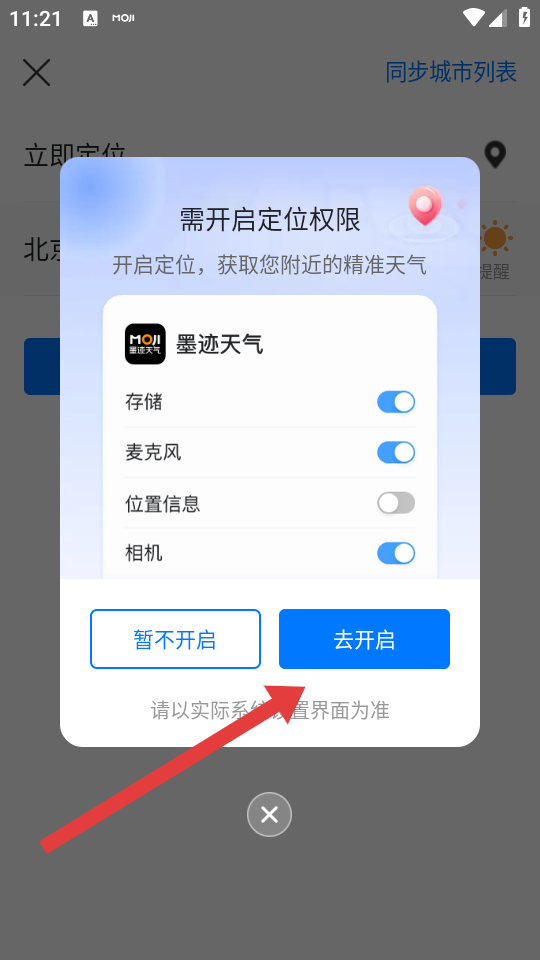 3、在需开启定位权限弹窗中,点击去开启按钮,进入系统设置界面开启位置信息权限,完成定位设置。