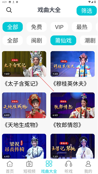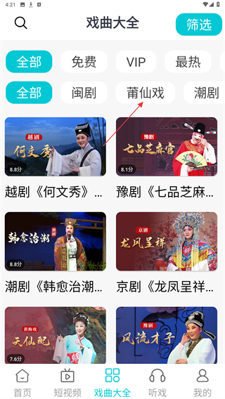 2、进入戏曲大全的页面内,点击莆仙戏的标签。