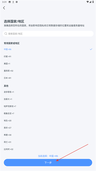3、进入选择国家/地区的页面内,选择后点击下一步。