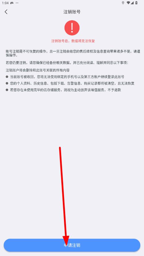 4、在注销账号页面,仔细阅读相关提示和注意事项,确认无误后,点击下方的申请注销按钮,按照提示完成账号注销操作。
