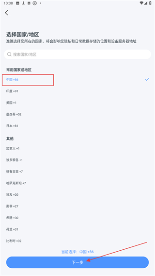 3、进入选择国家/地区的页面内,选择后点击下一步。