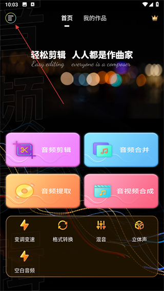 1、打开音频剪辑提取器应用,点击界面左上角的菜单按钮,进入个人功能页面。
