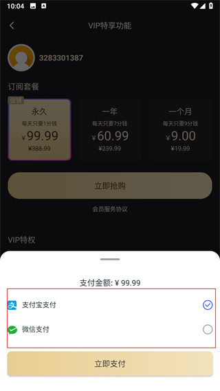 4、在支付方式选择框中,选择支付宝支付或微信支付,点击立即支付按钮,即可成功购买会员。
