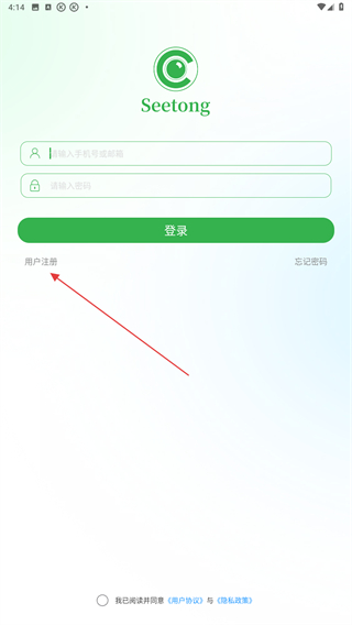 1、打开seetong的应用,点击左侧用户注册的按钮。