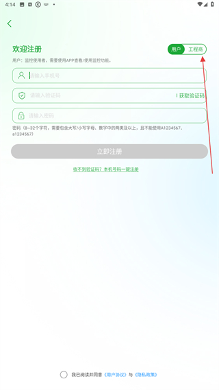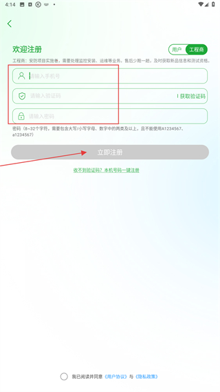 3、输入手机号、验证码以及密码,再点击立即注册。