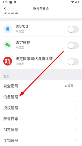 3、在账号与安全页面,点击设备管理进入设备管理界面。