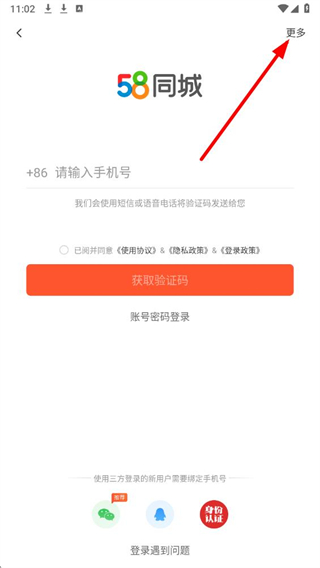 1、在58同城登录界面中,点击右上角更多选项,可展开更多操作选项。