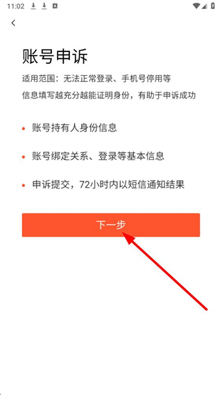 3、在账号申诉页面,阅读适用范围与信息要求后,点击下一步按钮,进入账号确认环节。