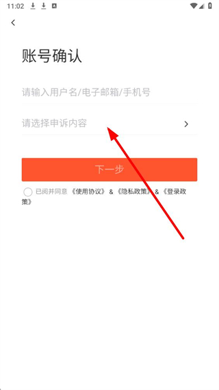 4、在账号确认页面,输入账号相关信息并选择申诉内容,勾选协议后,点击下一步即可继续申诉流程。