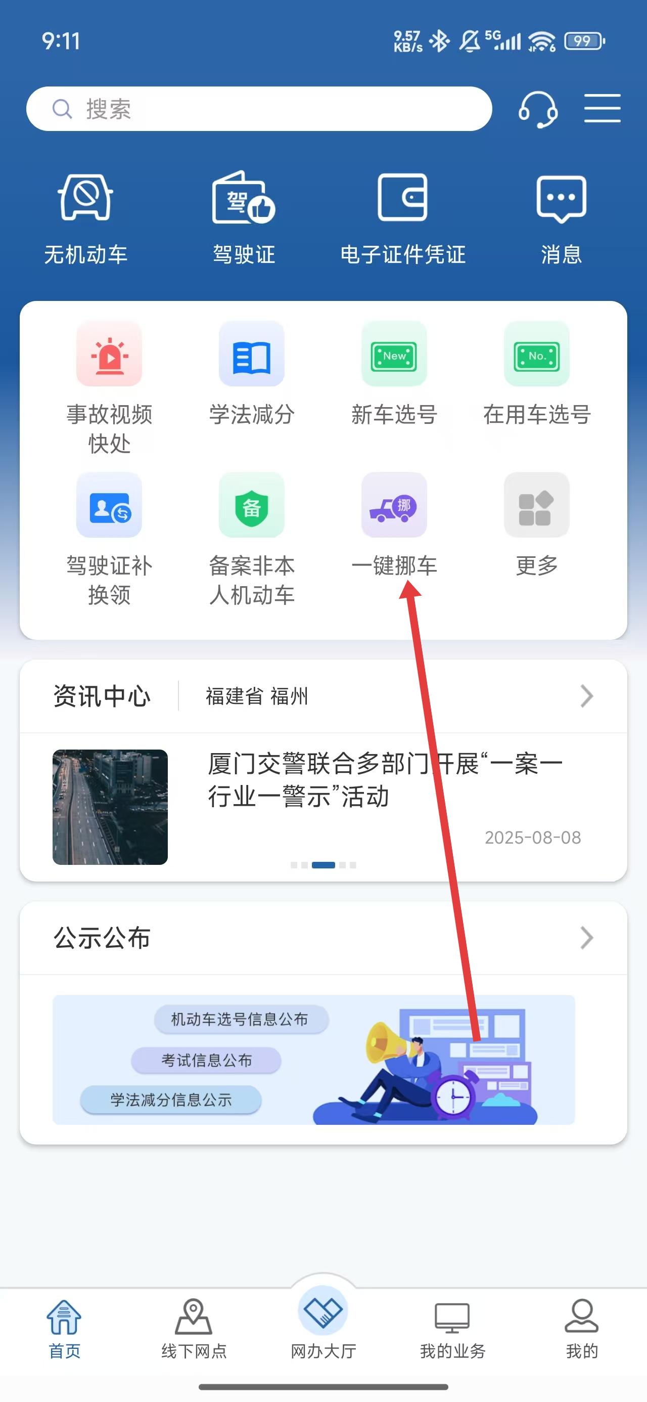 1、在交管12123首页中,可以点击一键挪车按钮进入查看相关功能。