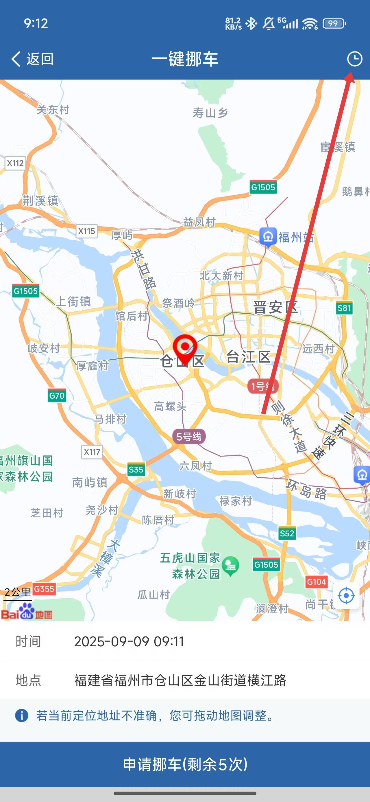 2、进入到一键挪车页面后,可以点击右上方的时间图标,进入查看历史记录。